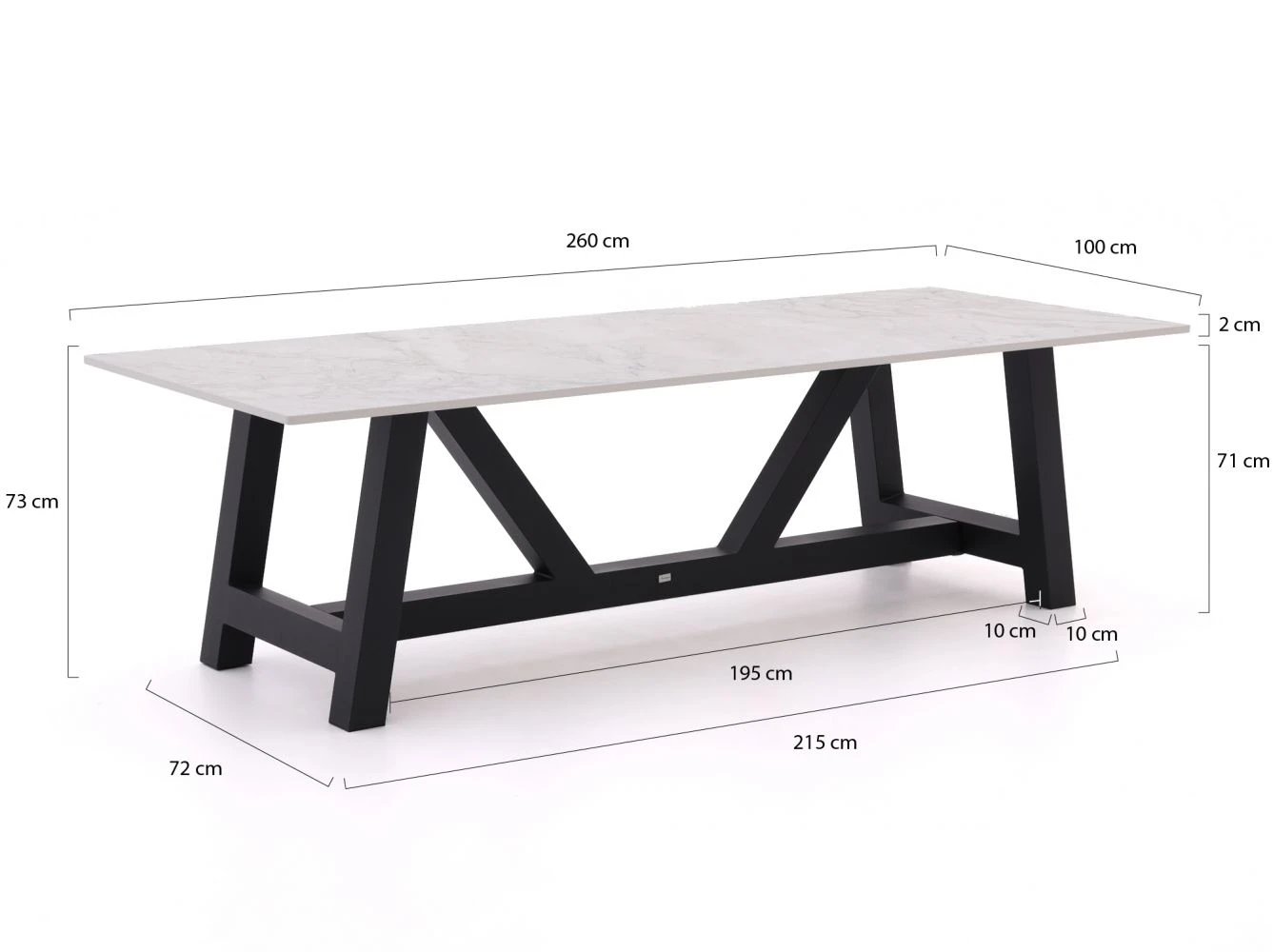Die helle Tischplatte dieses Gartentisches besteht aus Dekton. Dekton ist aus Glas-, Porzellan- und Quarzpartikeln gefertigt und hat das Aussehen von Naturstein. Das Material ist kratz- und fleckenfest, sowie hitze-, frost- und UV-beständig. Durch die robuste und ultrakompakte Verarbeitung ist dieses Material besonders gut für den Außenbereich geeignet. Das dunkle Gestell des Tisches besteht aus pulverbeschichtetem Aluminium. Pulverbeschichtet bedeutet, dass die Farbe unter großer Hitze auf das Aluminium gebrannt wird. Hierdurch ist der Tisch ideal vor Witterungseinflüssen geschützt. Die genauen Abmessungen finden Sie bei den Produktbildern.