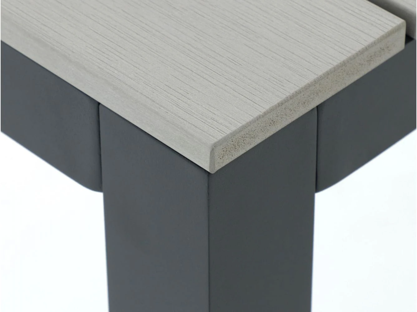 Der Bellagio Fidenza Bartisch besteht aus einem Aluminiumgestell in der Farbe Charcoal und einer Tischplatte aus Polywood Latten. Aluminium ist leicht, stark und pflegeleicht. Das Polywood, das für die Tischplatte verwendet wurde, wird seit Jahren in der Gartenmöbelindustrie verwendet. Polywood ist ein Kunststoff mit dem Aussehen und der Struktur von Holz. Es ist stark, leicht und pflegeleicht vergleichbar mit Aluminium.
