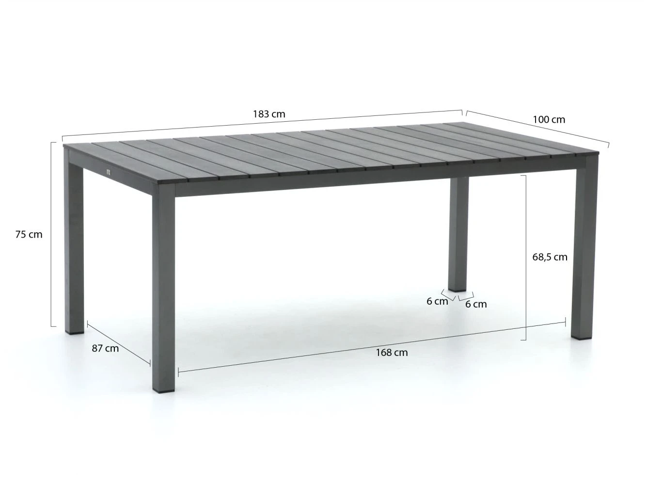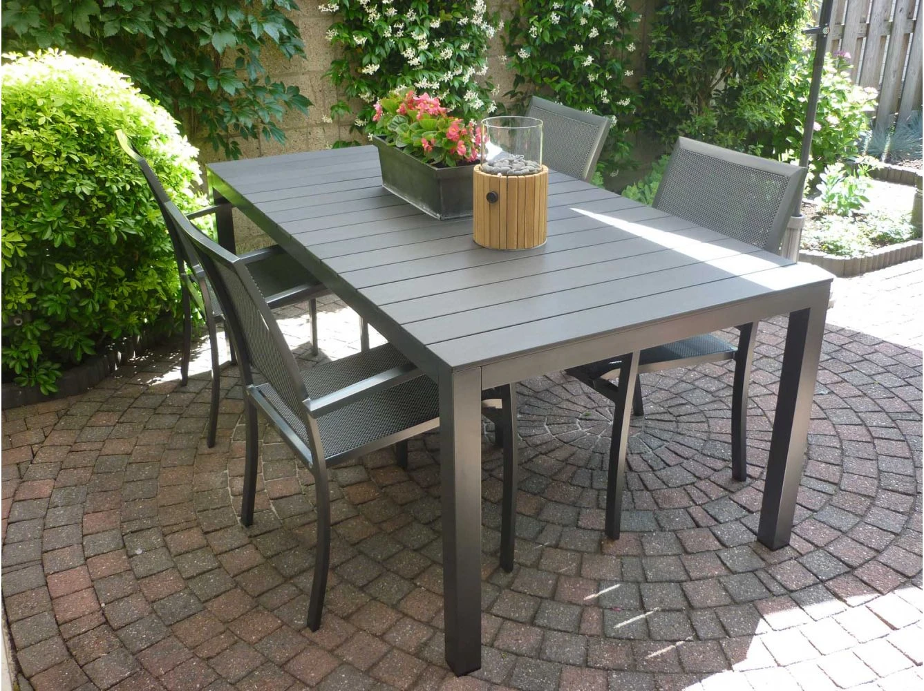 Das Gestell des Fidenza Esstisches ist aus pulverbeschichtetem Aluminium gefertigt. Pulverbeschichtet bedeutet, dass die Farbe unter großer Hitze auf das Aluminium gebrannt wird. Hierdurch ist der Gartentisch ideal vor Witterungseinflüssen geschützt. Die Tischplatte ist aus Polywood gefertigt. Polywood ist ein Kunststoff mit dem Aussehen und der Struktur von Holz. Beide Materialien sind pflegeleicht, leicht im Gewicht und stabil. Außerdem rostet Aluminium nicht durch.