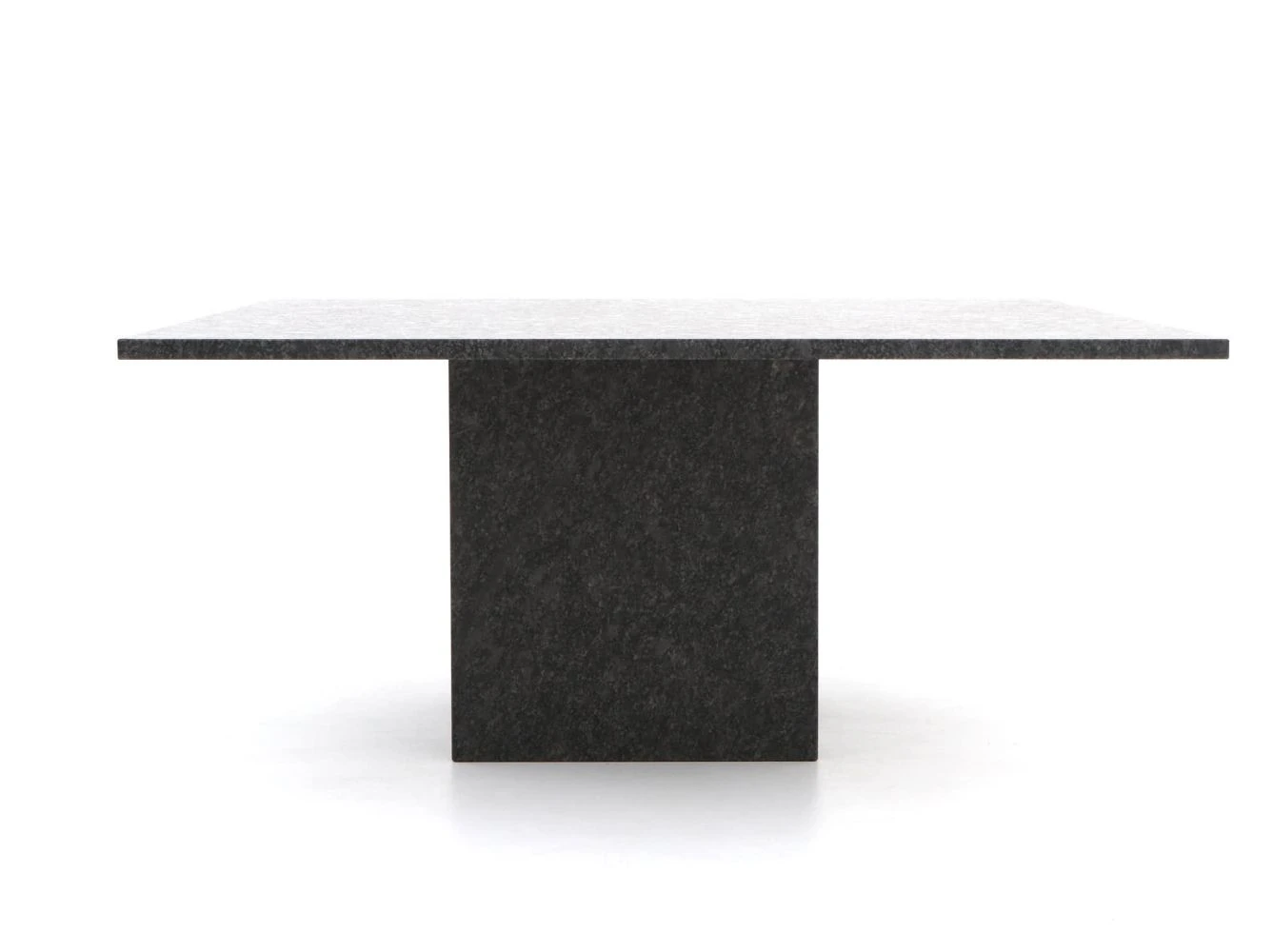 Der Bernstein Granit Esstisch besteht aus einer viereckigen Säule und einer viereckigen Tischplatte.