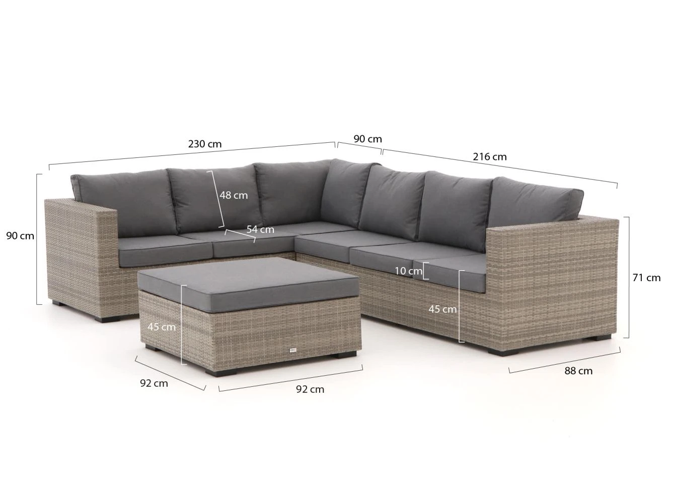 Das Forza Giotto Ecklounge-Set ist ein modern gestaltetes Ecklounge-Set aus dem Kees Smit Gartenmöbel Sortiment. Gemütlich Kaffeetrinken mit Familie und Freunden? Dieses Lounge-Set bietet Ihnen genug Platz. Die Fußbank kann auch als Beistelltisch genutzt werden, wenn Sie Ihr Set um eines von unseren Tabletts aus dem ROUGH-X Sortiment ergänzen. Zusätzlich können Sie auch mit Freunden zusammen essen, wenn Sie das Ecklounge-Set mit einem Esstisch kombinieren. Ihnen ein individuelles Gartenmöbel-Set zusammenzustellen, ist in vielen Fällen auch möglich. Bitte kontaktieren Sie uns, um die Möglichkeiten zu besprechen. Dieses Ecklounge-Set besteht aus den folgenden Elementen: