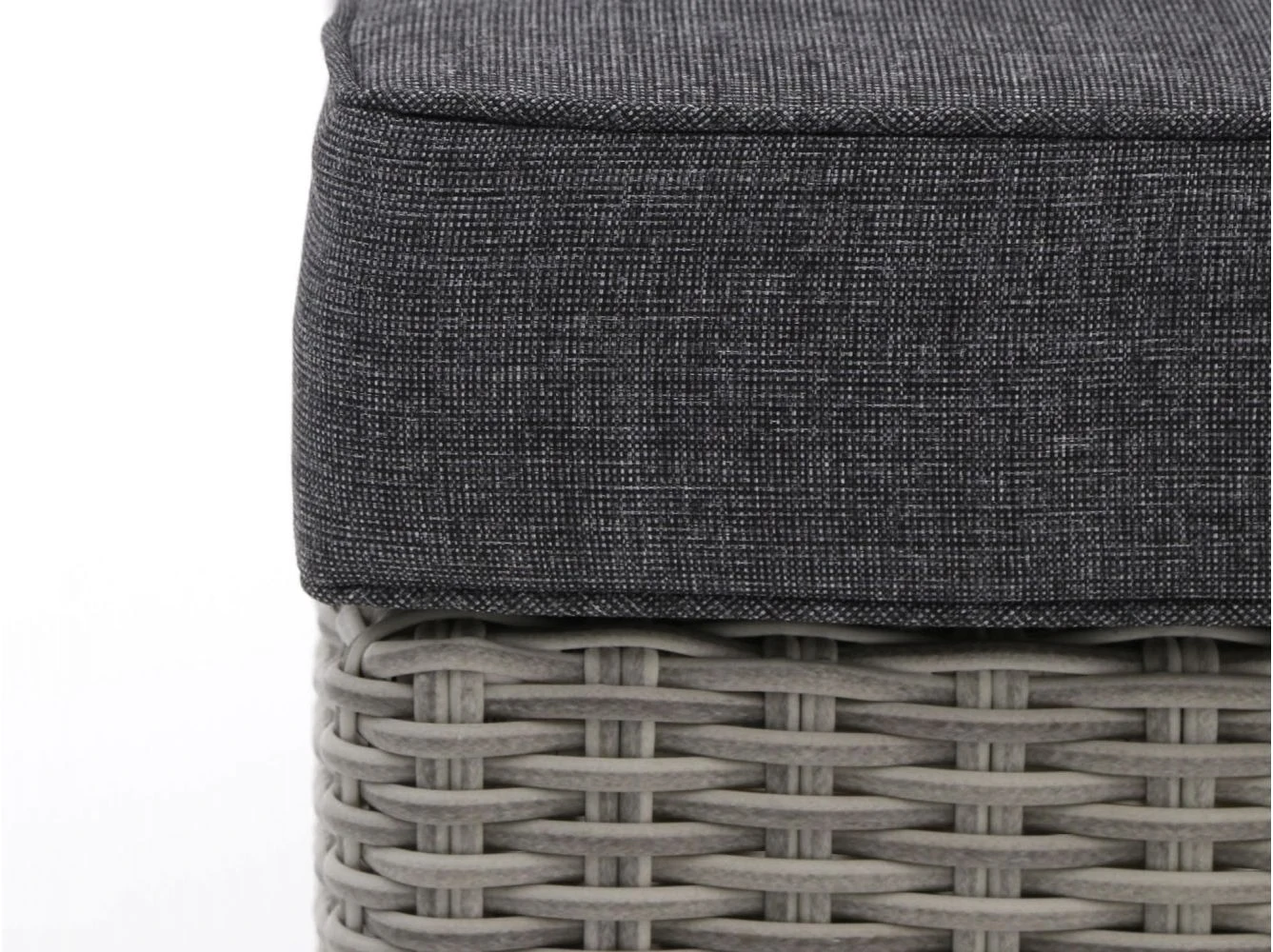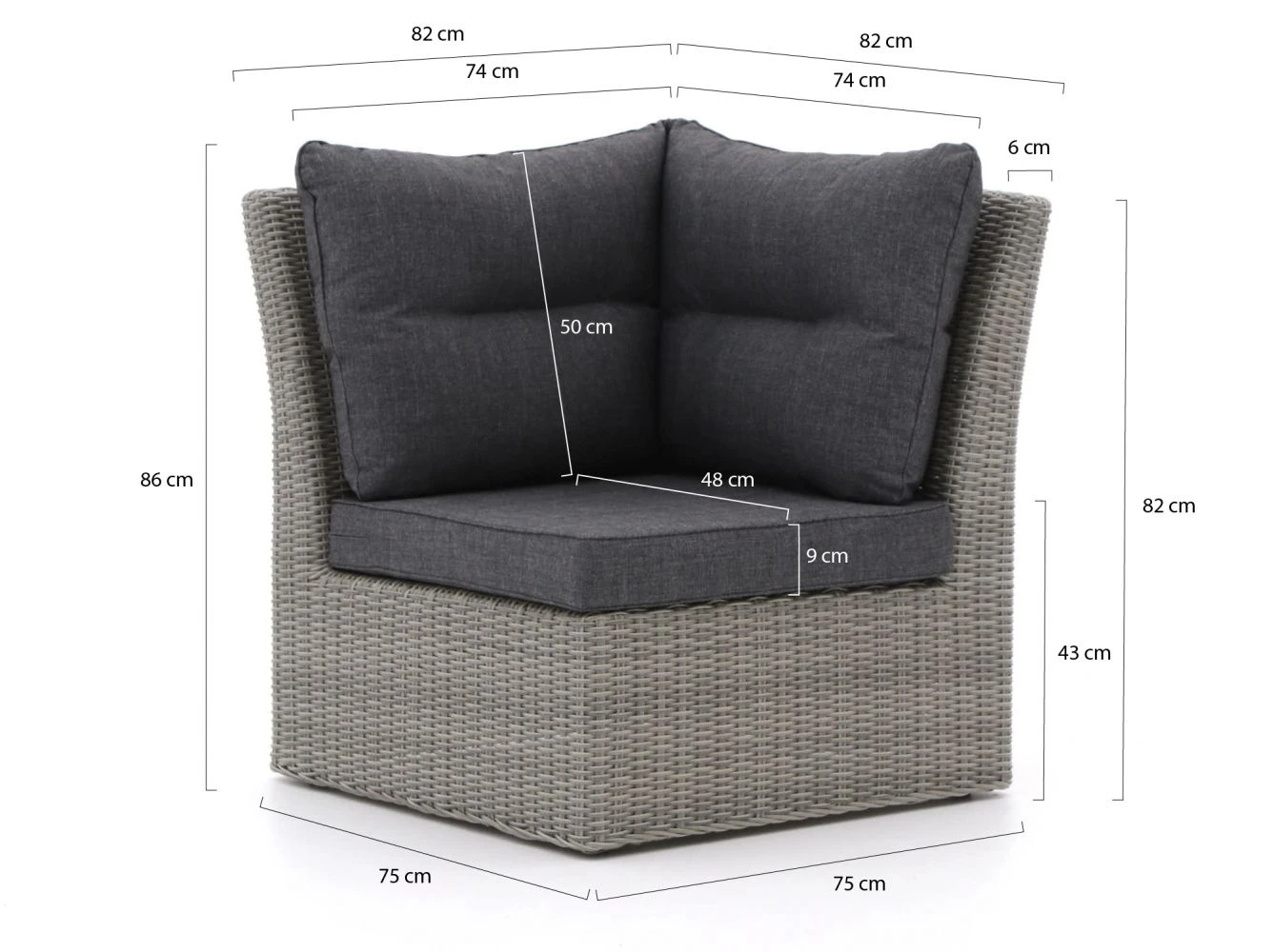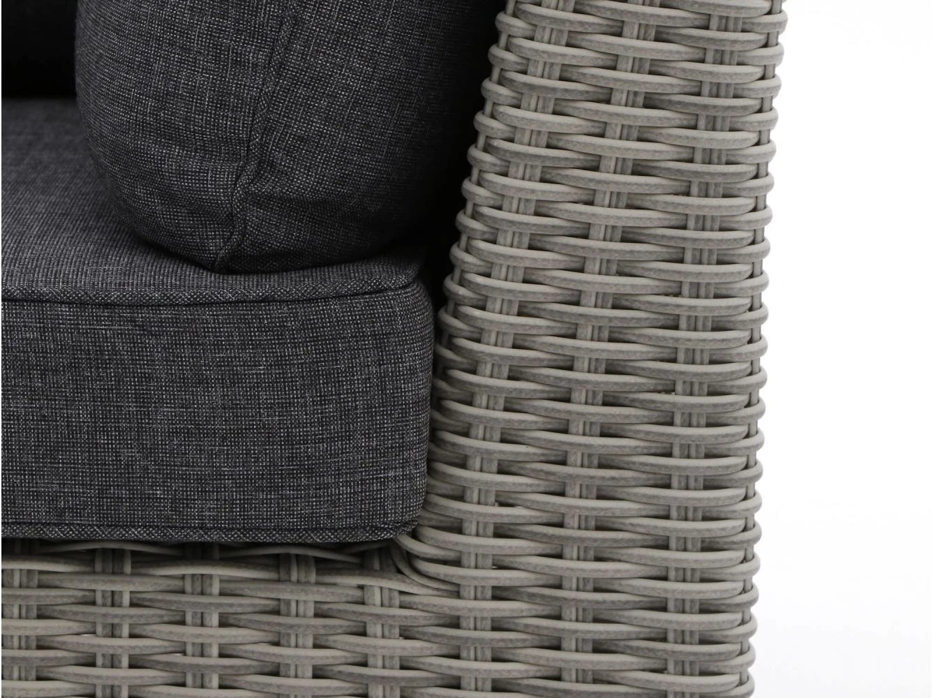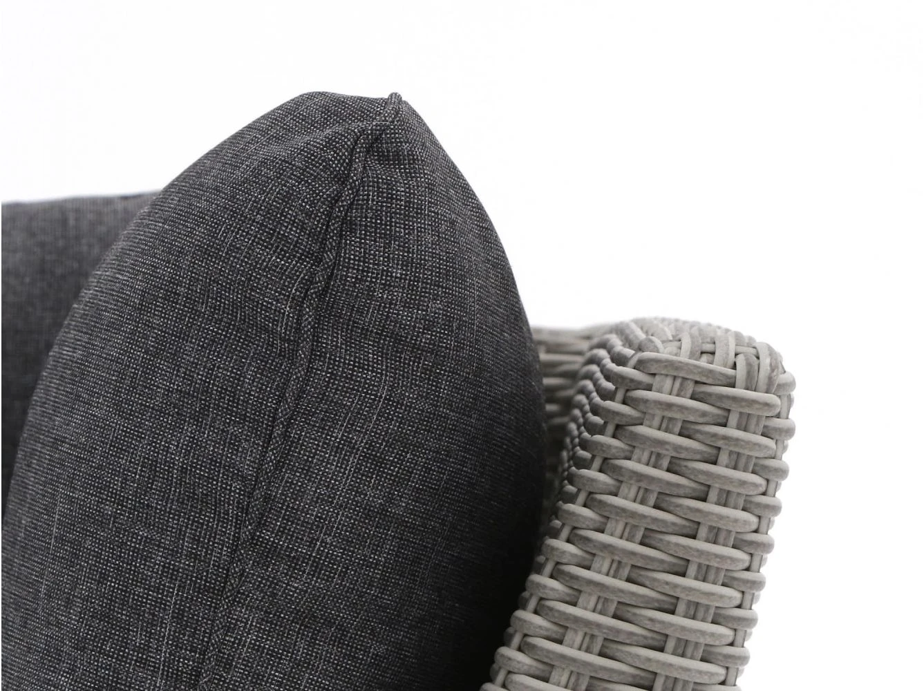 Das obere halbrunde Polyrattangeflecht besticht durch seine hübsche Optik in der Farbe Graphit. Die komfortablen Sitz- und Rückenkissen in Antracite sind im Lieferumfang enthalten. Die Kissen können mit etwas Wasser und grüner Seife gereinigt werden. Verzichten Sie bei der Reinigung auf jeden Fall auf scharfe und aggressive Mittel. Alle Maße dieses Elementes finden Sie bei den Produktbildern.
