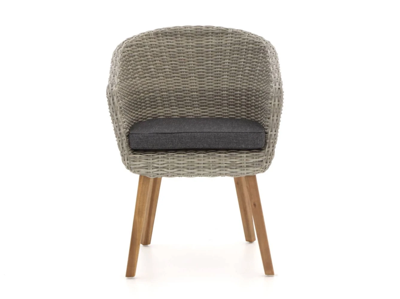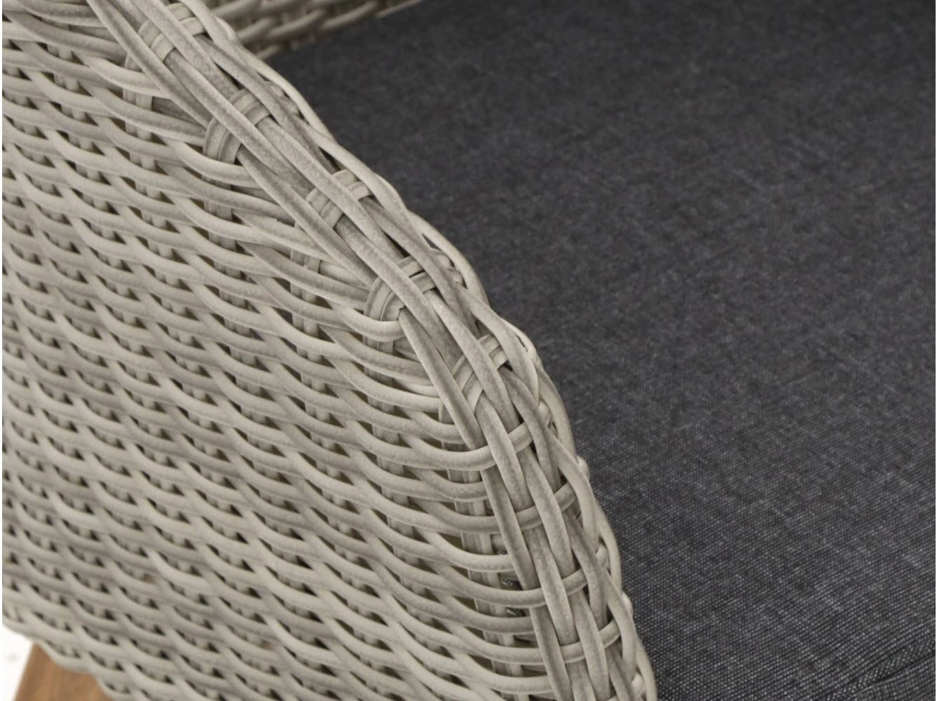 Das Gestell des Tropea Essstuhl besteht aus Aluminium und ist mit einem Flechtdraht aus Kunststoff umwickelt. Dieser Flechtdraht ist auch unter dem Namen Polyrattan bekannt. Die Kombination aus Aluminium und Polyrattan wird in der Gartenmöbelindustrie aufgrund der positiven Eigenschaften sehr gern verwendet. Beide Materialien sind pflegeleicht, leicht im Gewicht und stabil. Außerdem rostet Aluminium nicht. Die Stuhlbeine des Tropea Essstuhls sind aus tropischem Hartholz gefertigt, welches widerstandsfähig ist und eine warme Ausstrahlung hat. Der Essstuhl wird mit einem bequemen Sitzkissen geliefert. Der Bezug des Sitzkissens verfügt über einen Reißverschluss und kann bei niedriger Temperatur im Schonwaschgang gewaschen werden. Genaue Abmessungen finden Sie bei den Produktbildern.