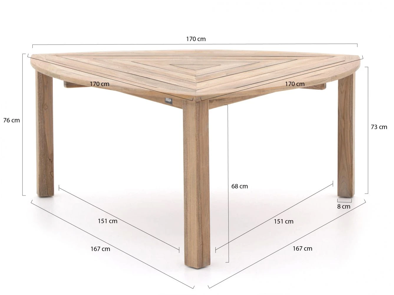 Der ROUGH-S Triangular Esstisch (170x170x170x76 cm) ist aus Teakholz gefertigt. Der Esstisch ist bereits mit einer Old Teak Greywash Waschung behandelt, wodurch der Esstisch robust aussieht und Sie diesen nicht behandeln müssen.